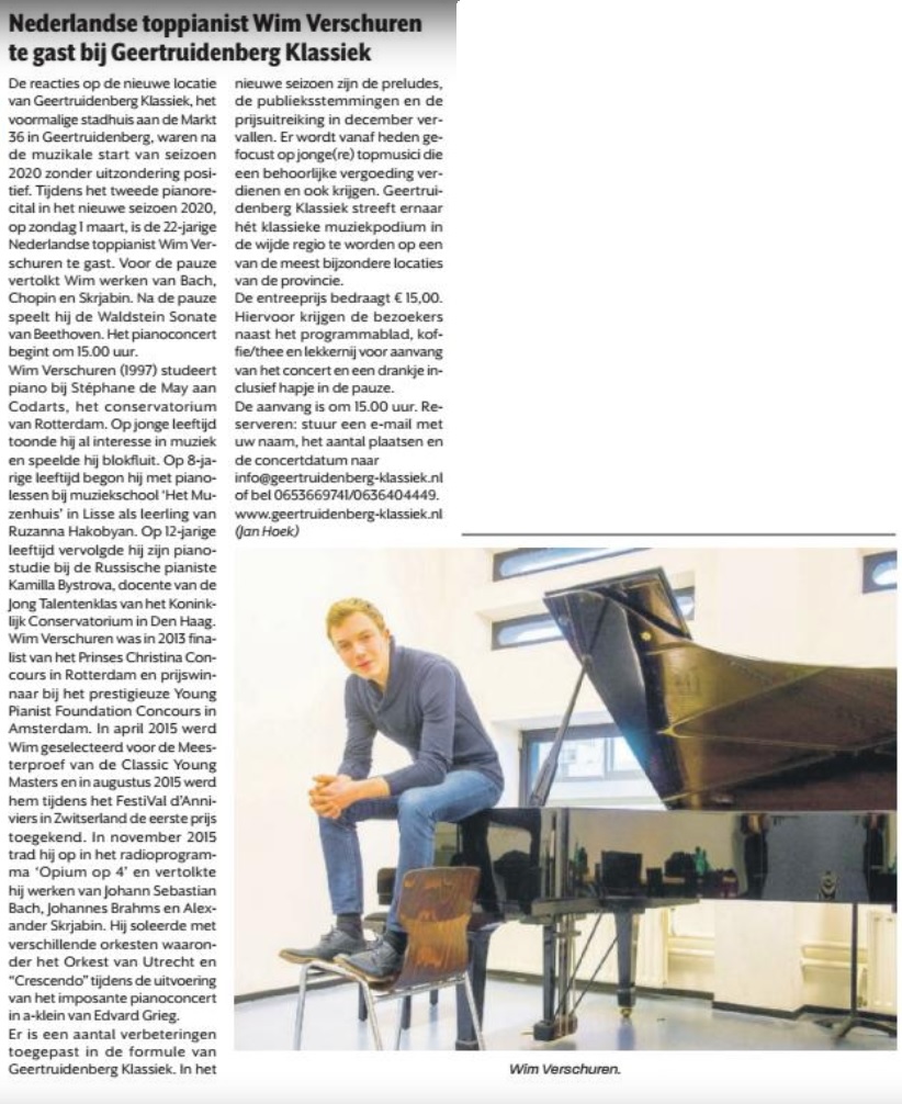 Wim Verschuren (1997) is afgestudeerd bij de Belgische meesterpianist Stéphane de May aan het conservatorium van Rotterdam. Op 7-jarige leeftijd begon hij met pianolessen en op 12-jarige leeftijd vervolgde hij zijn pianostudie bij de Russische pianiste Kamilla Bystrova, docente van de Jong Talentenklas van het Koninklijk Conservatorium in Den Haag. Wim Verschuren is prijswinnaar van verschillende presitigieuze concoursen waaronder het Prinses Christina Concours (2013), het YPF concours in Amsterdam (2014) en het Festival d´Anniviers in Zwitserland (2015). In 2015 werd hij laureaat van de stichting Classic Young Masters en in 2018 won hij in Vught Klassiek de publieks- en persprijs. Naast soloconcerten treedt Verschuren ook op als solist met orkest. Hij soleerde onder andere met het Orkest van Utrecht tijdens de uitvoering van het Carnaval des Animaux van Saint-Saëns (2014). In 2019 voerde hij met het Orkest van Utrecht en het Serenata Symphony Orchestra viermaal het befaamde derde pianoconcert van Beethoven uit. In 2022 soleerde hij met de Wageningse Studenten Koor en Orkest Vereniging tijdens twee uitvoeringen van het pianoconcert van Grieg.